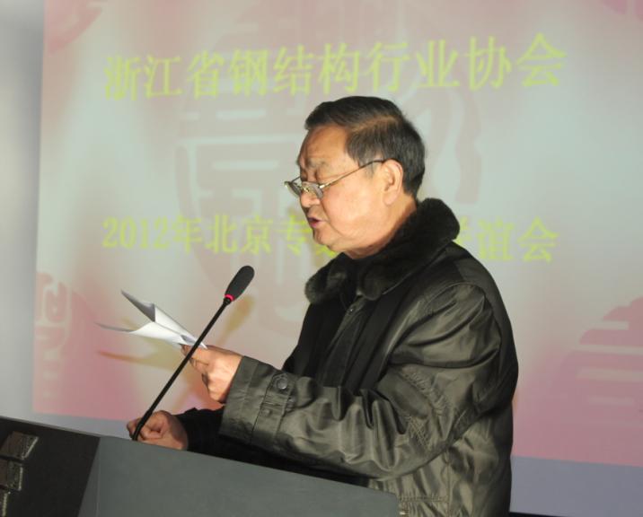 | 张凯声同学在“浙江省钢结构行业协会2012年北京联议会“上(2012-02-03) | 吴国林(右1)、胡先义(右2)、 张伟(左2,北京建工付总工)在联议会上(2012-02-03) |